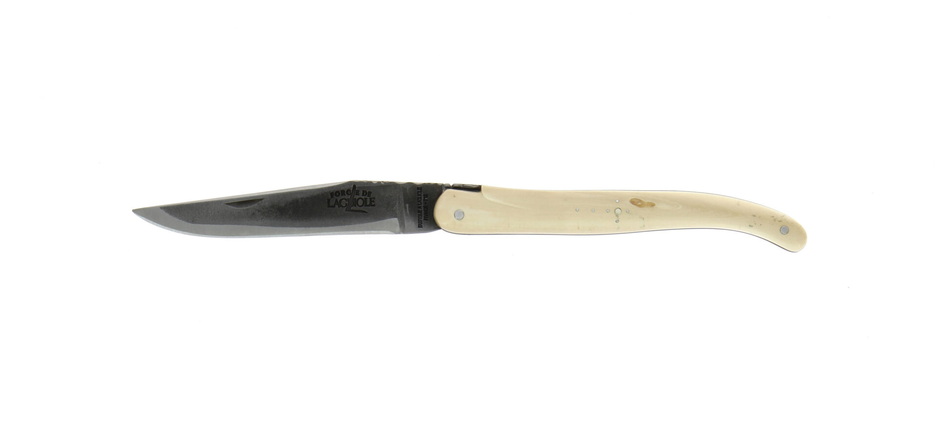 Découvrez ce couteau pliant ciselé main, 12cm, plein manche en ivoire de mammouth coeur, lame brut de forge, finition satinée