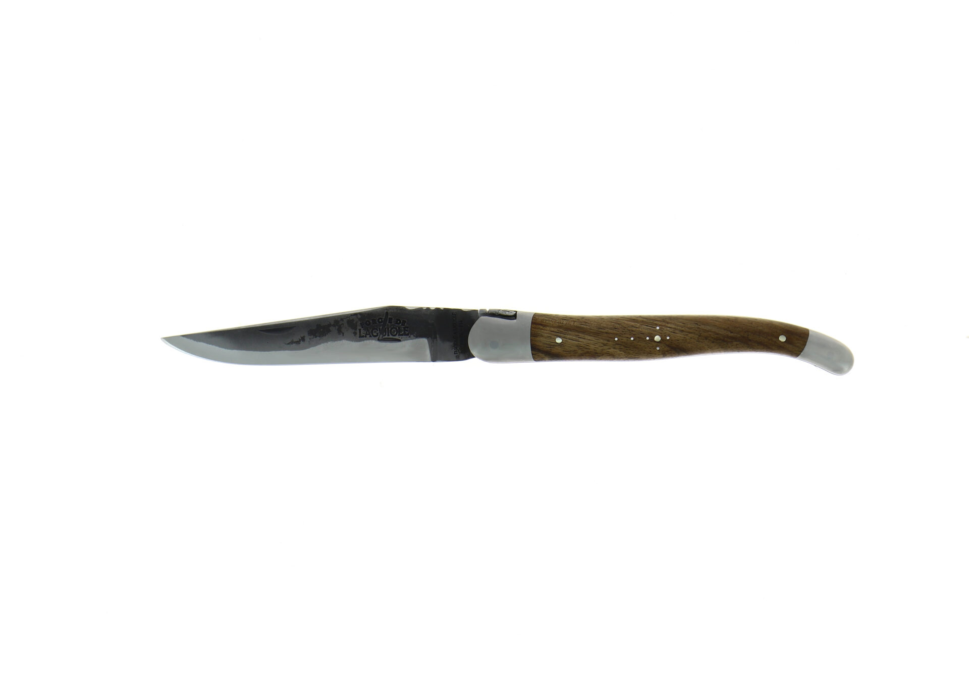 Découvrez ce couteau pliant ciselé main 12cm en noyer, 2 mitres inox finition satinée et lame brut de forge.