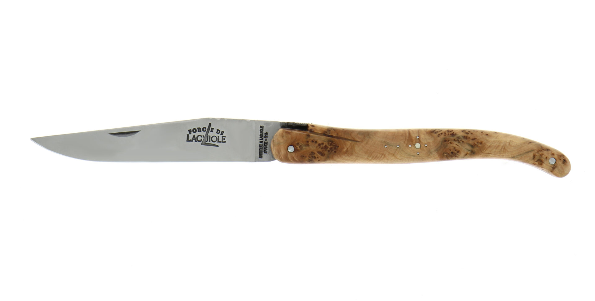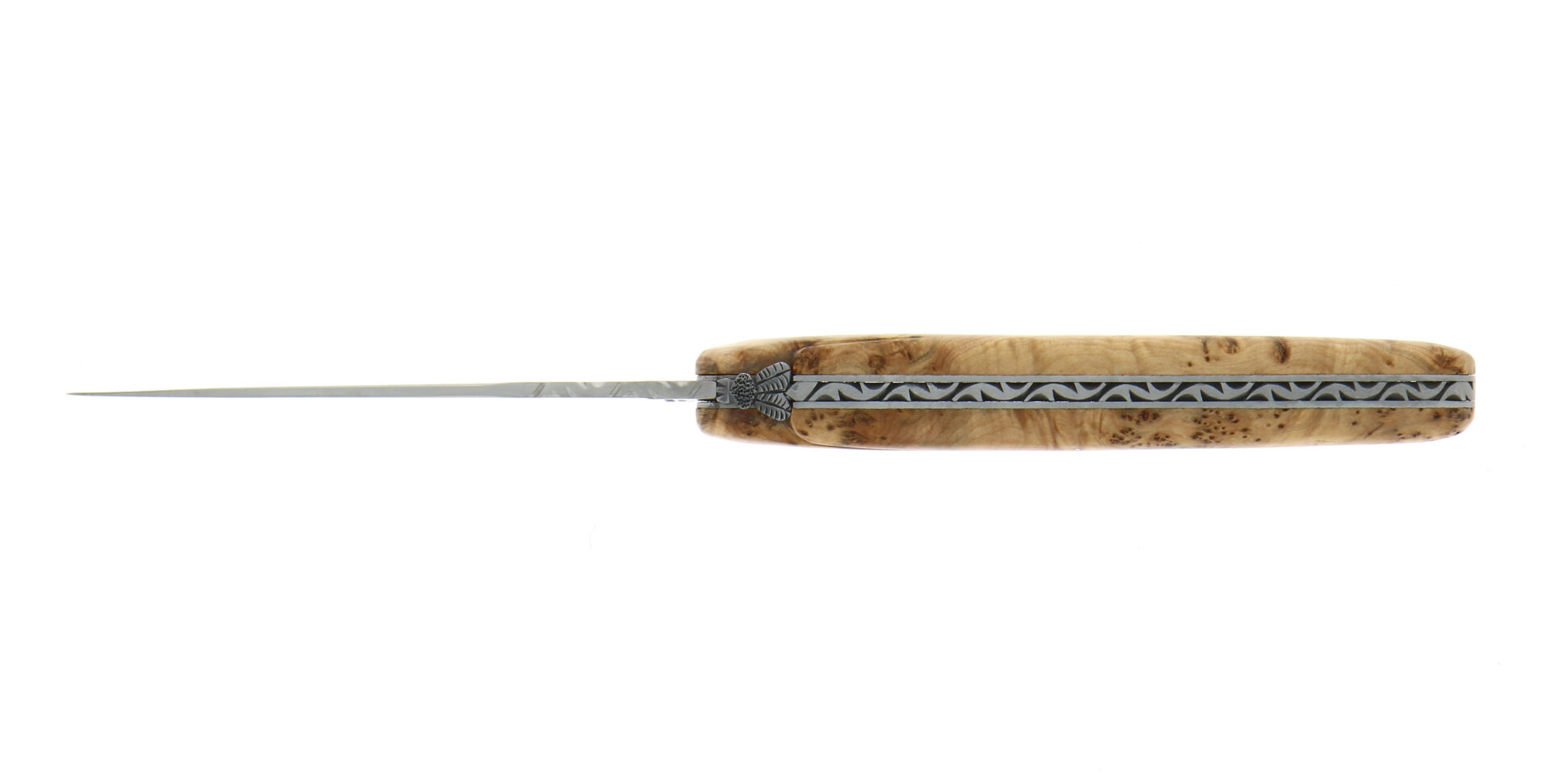 Découvrez ce couteau pliant ciselé main, 12cm, plein manche en genévrier, lame standard T14, finition satinée.