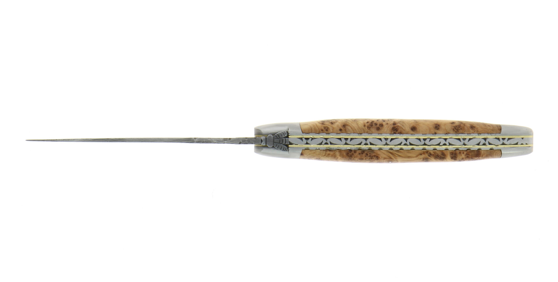 Découvrez ce Couteau pliant Forge de Laguiole ciselé main en genévrier finition satinée et lame damas inox et double platine guillochée