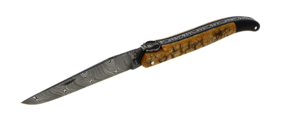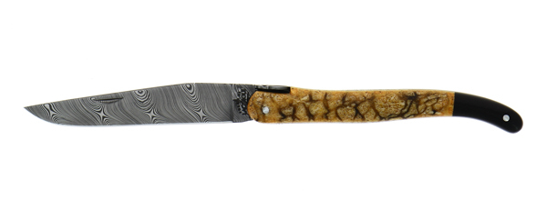 Ce couteau d'exception est un modèle 12 cm 1 pièce, avec un manche en corail tigré marron, avec un placage et une mitre arrière en ébène. Une belle abeille et une lame Damas Inox Twist viennent sublimer ce couteau pliant.