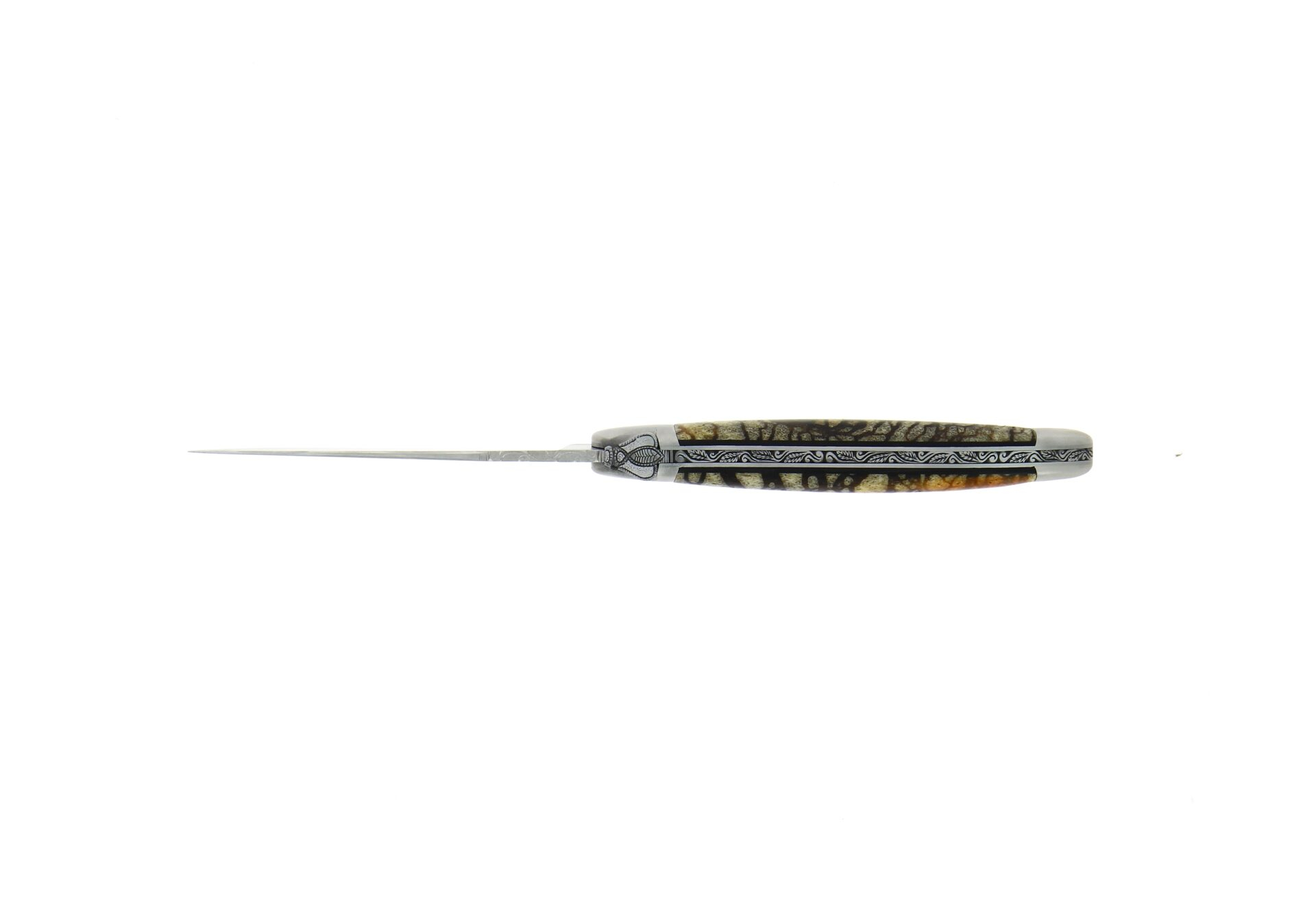 Ce couteau d'exception est un modèle 1 pièce de 12cm, avec un manche en corail tigré. Ce couteau a un style traditionnel avec une abeille, un ressort et une lame finition satinée. Il possède également 2 mitres inox inox et un plaquage en ébène.