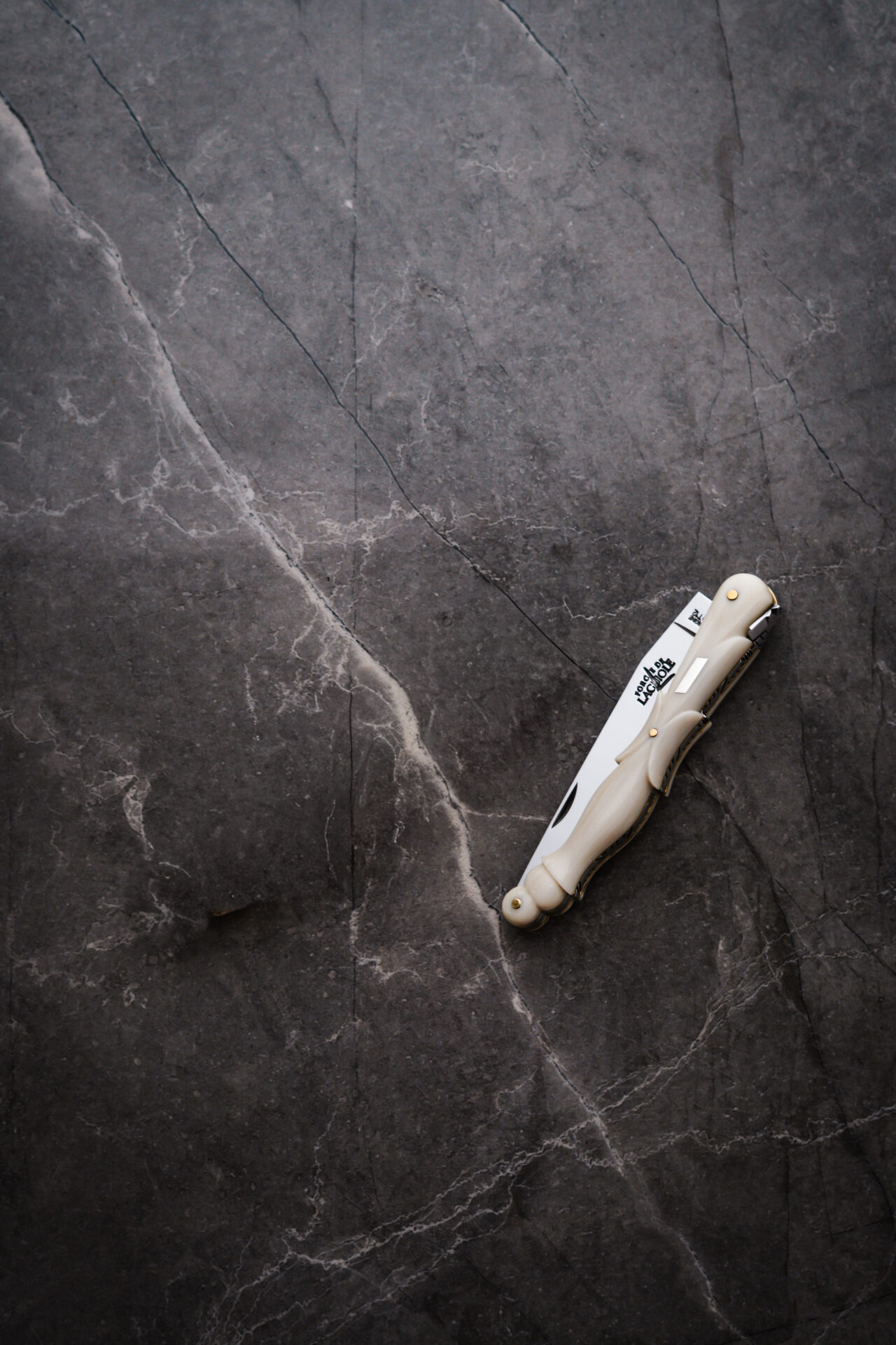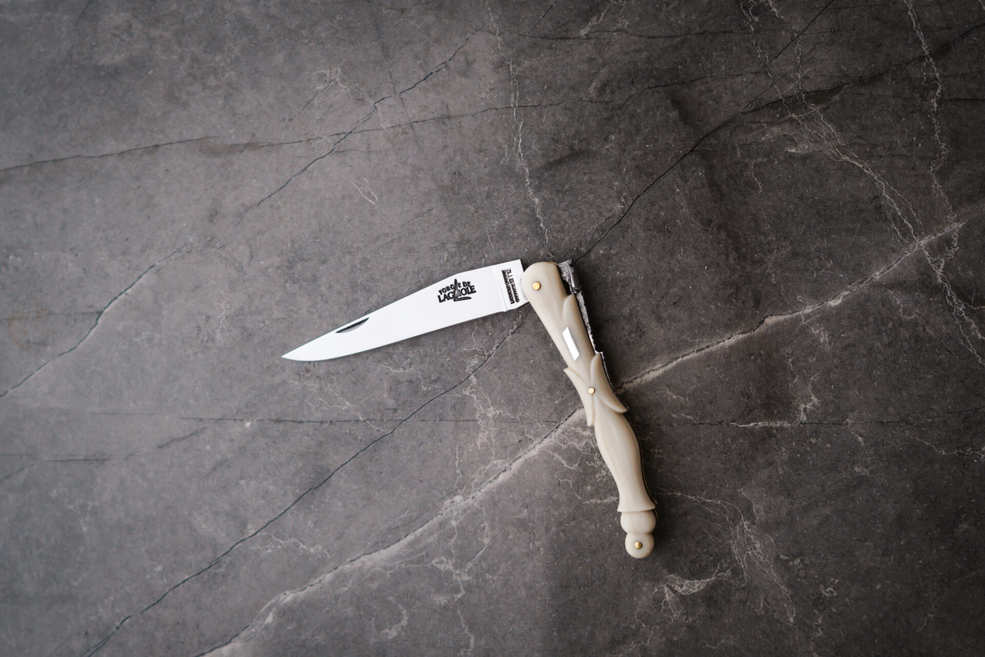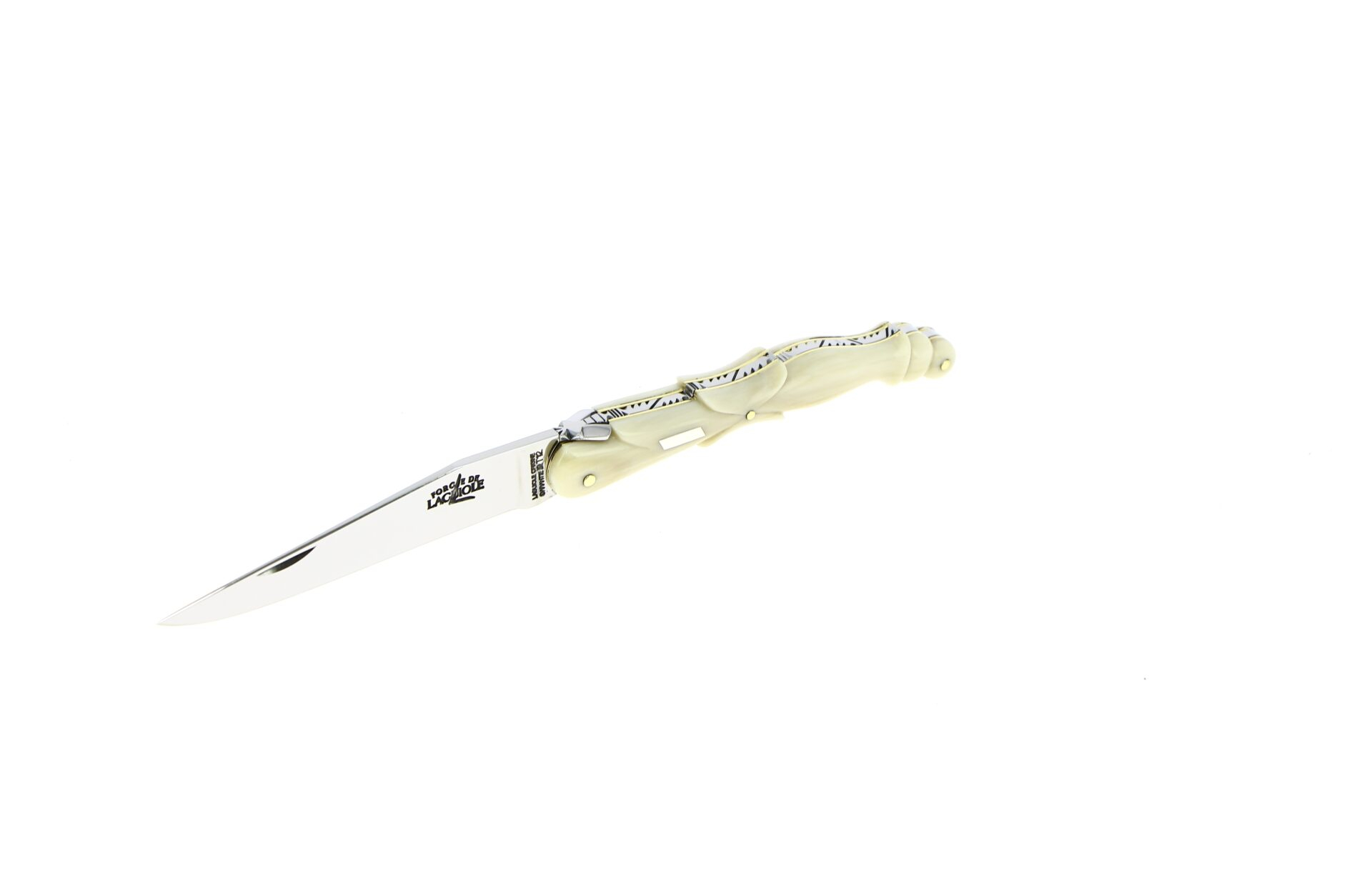 Ce couteau pliant Laguiole d’exception est un modèle une pièce, doté d’un manche en corne claire sculptée en aile de pigeon, travail d’une grande finesse.