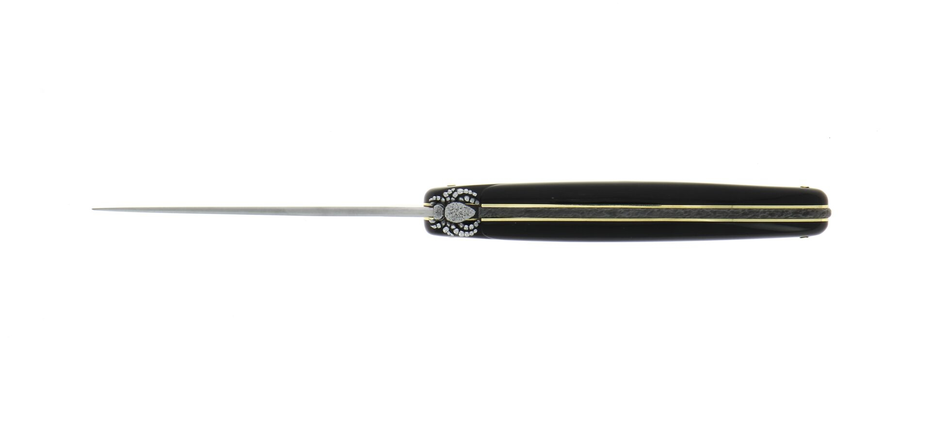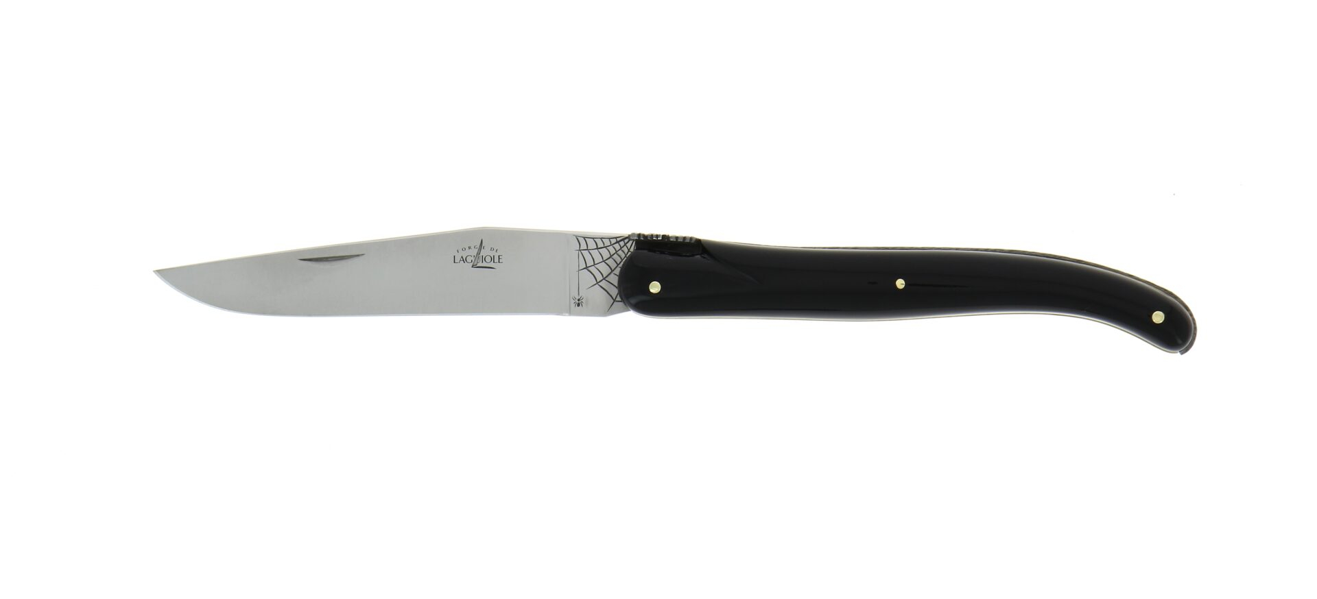 Ce couteau pliant Laguiole haut de gamme est un modèle 12 cm une pièce, doté d’un manche plein en corne noire, à l’élégance sobre et intemporelle. Il se distingue par un ressort noirci, sublimé par des platines en laiton brillant, offrant un contraste raffiné. Une araignée finement travaillée remplace la traditionnelle abeille, tandis qu’une toile d’araignée gravée sur le talon de la lame vient renforcer l’identité singulière de ce couteau d’exception.