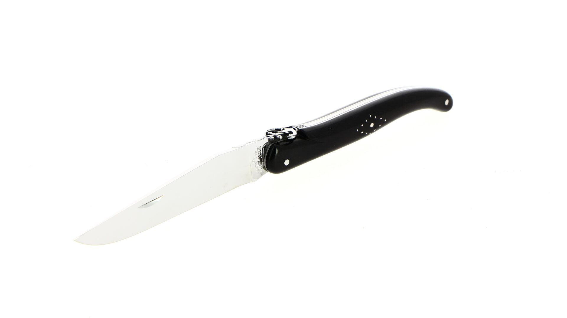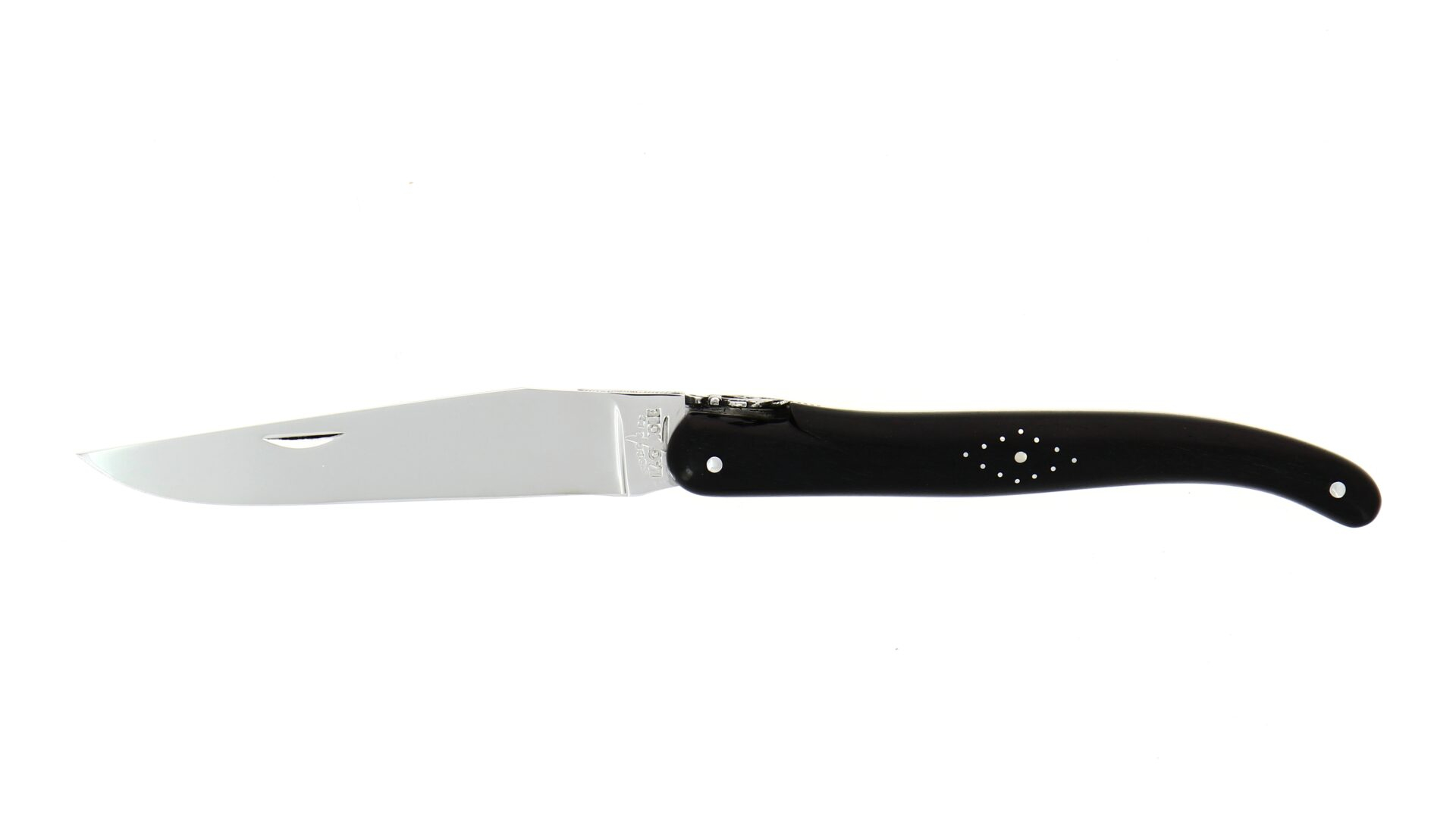 Les platines et la lame en inox à finition brillante soulignent l’élégance et la qualité de ce couteau pliant haut de gamme, alliant tradition Laguiole et design unique.