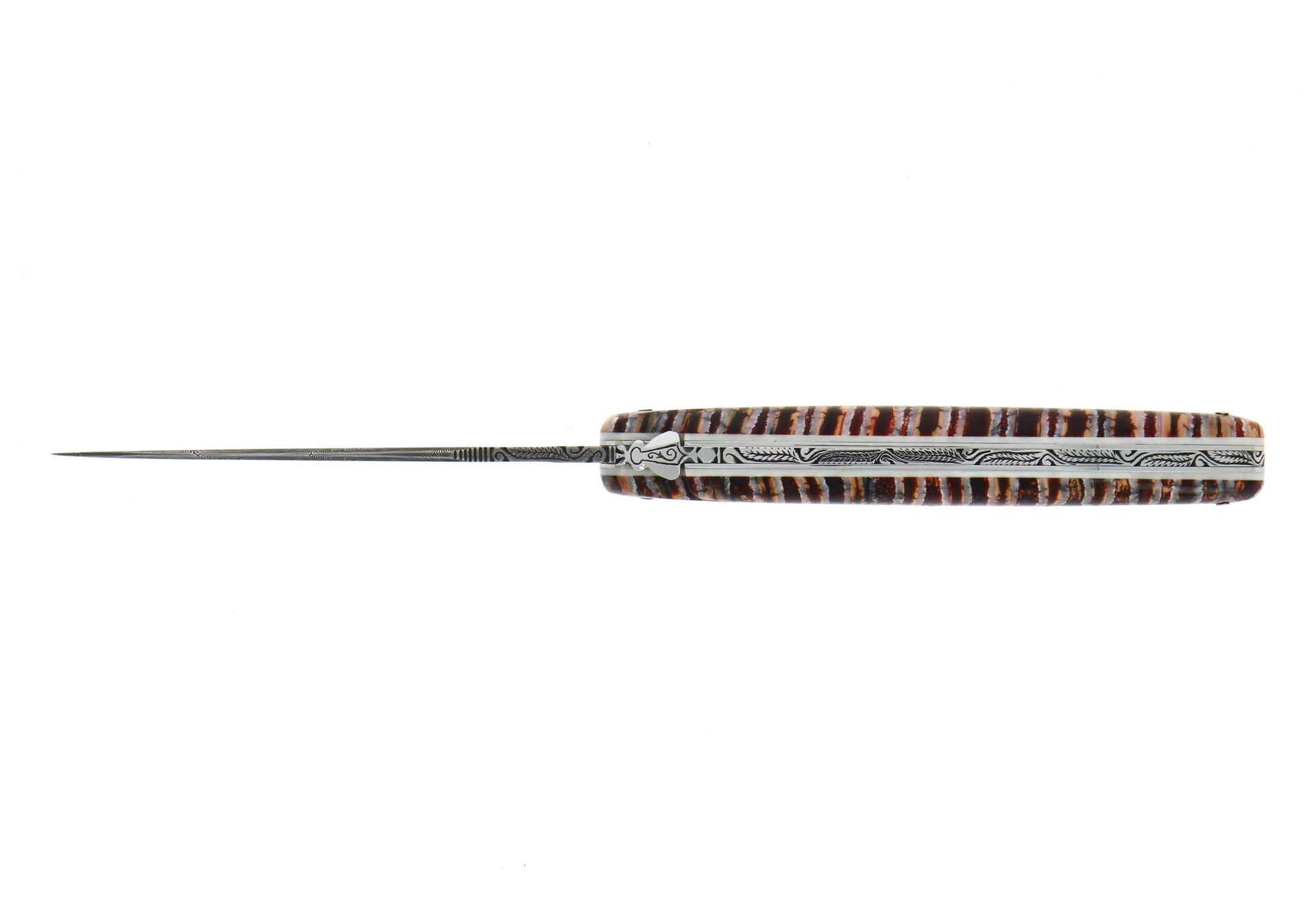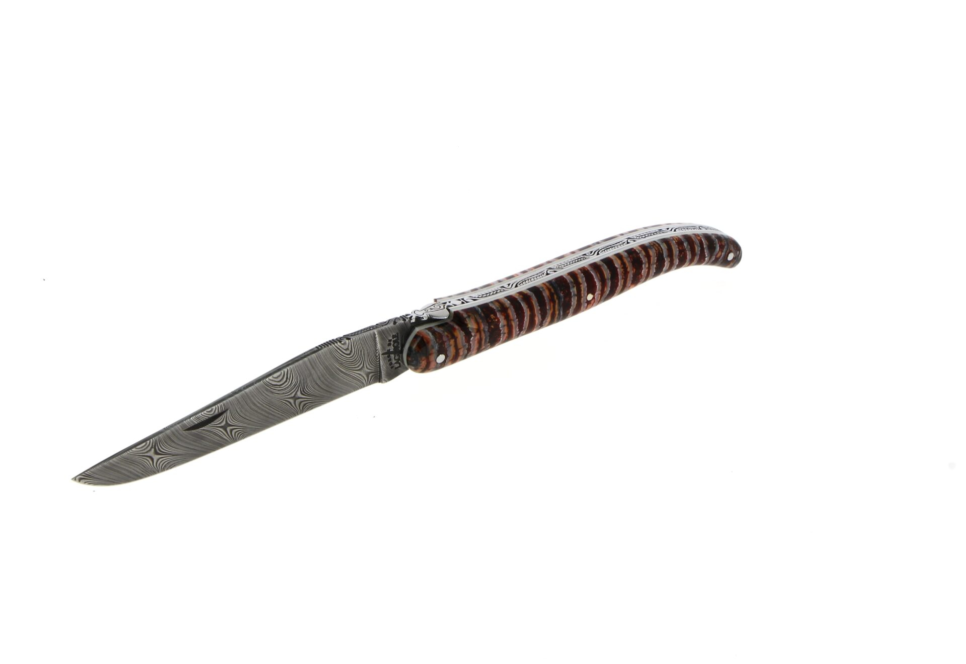 Ce couteau Laguiole d’exception est un modèle une pièce, doté d’un manche en molaire de mammouth rouge, matériau rare au rendu spectaculaire. Il se distingue par un guillochage élégant, finement travaillé et prolongé avec harmonie le long de la lame.