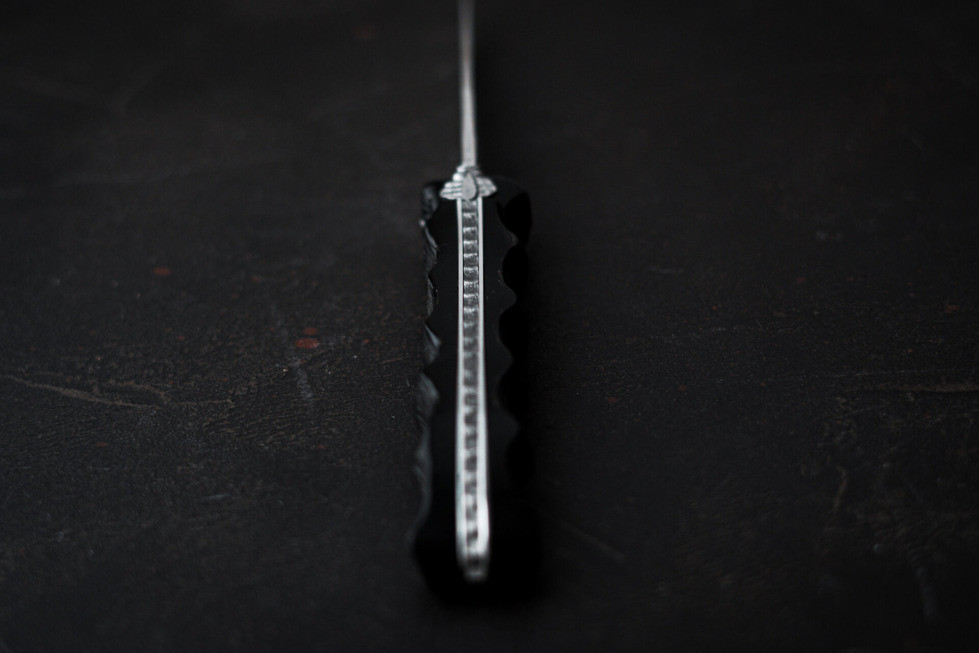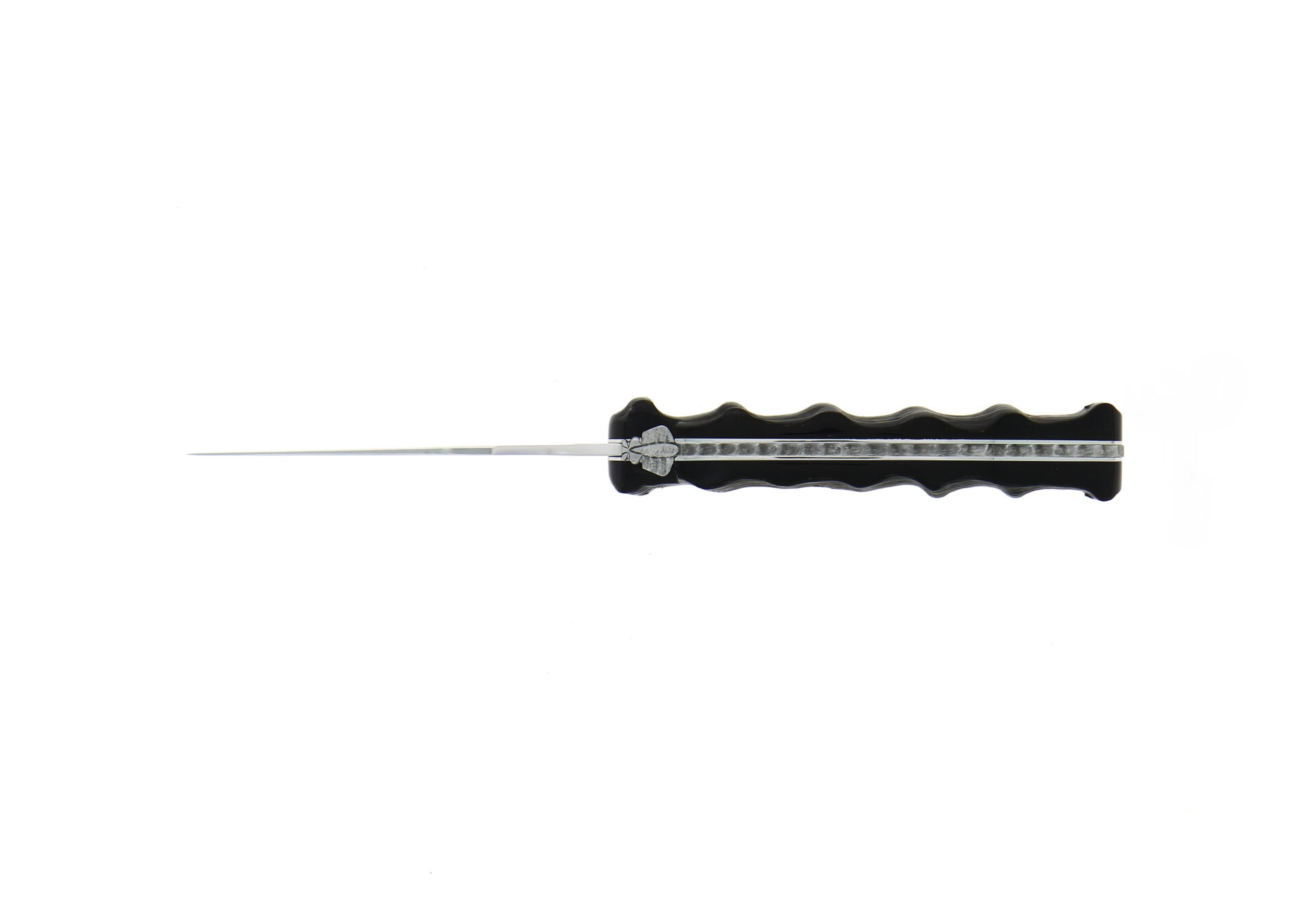 Ce couteau d'exception est un modèle 1 pièce de 12cm, avec un plein manche en impala sculpté. Ce couteau a un style brut avec une abeille, un ressort vertèbre et une lame finition satinée.