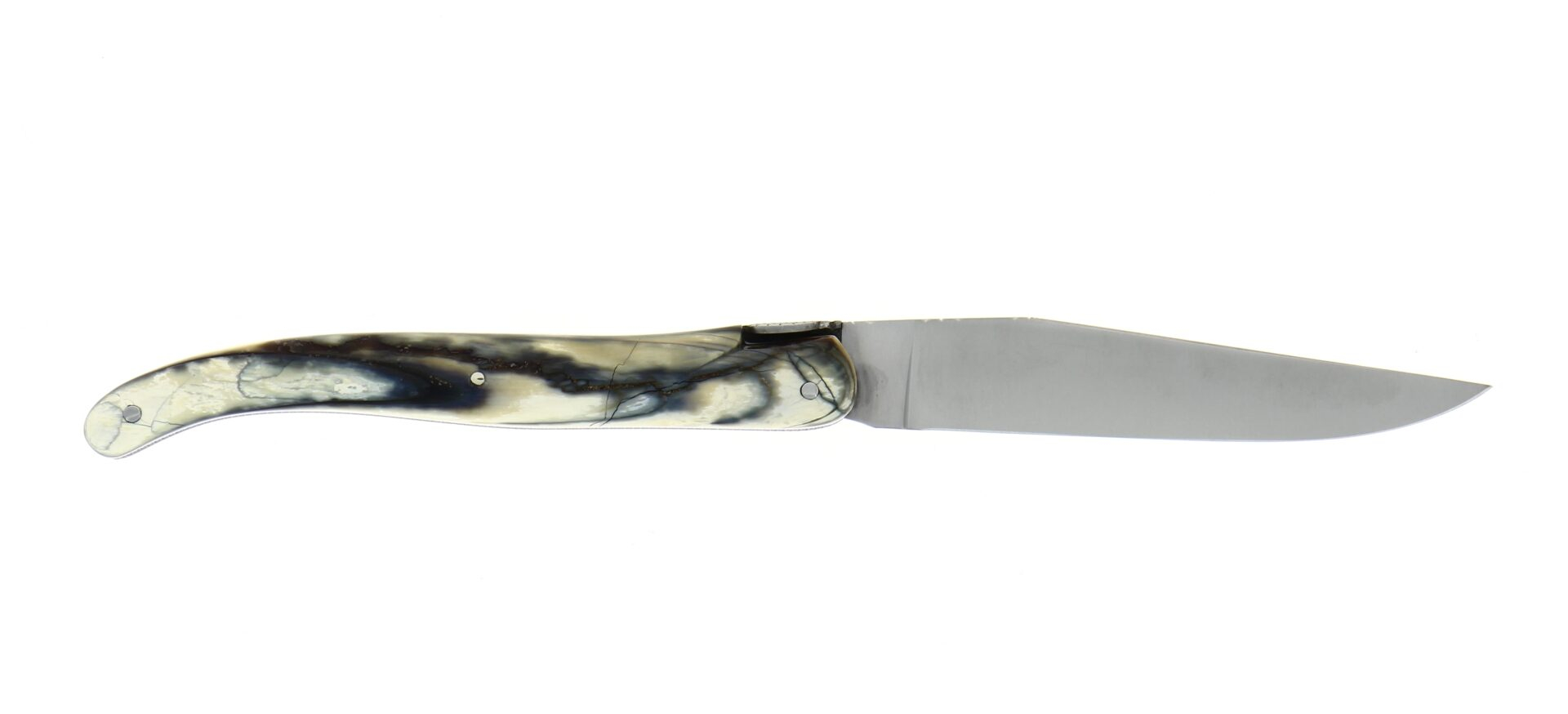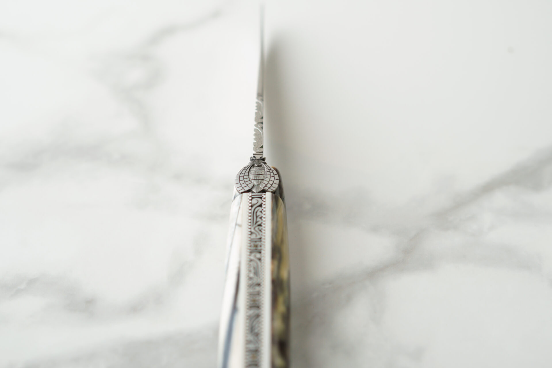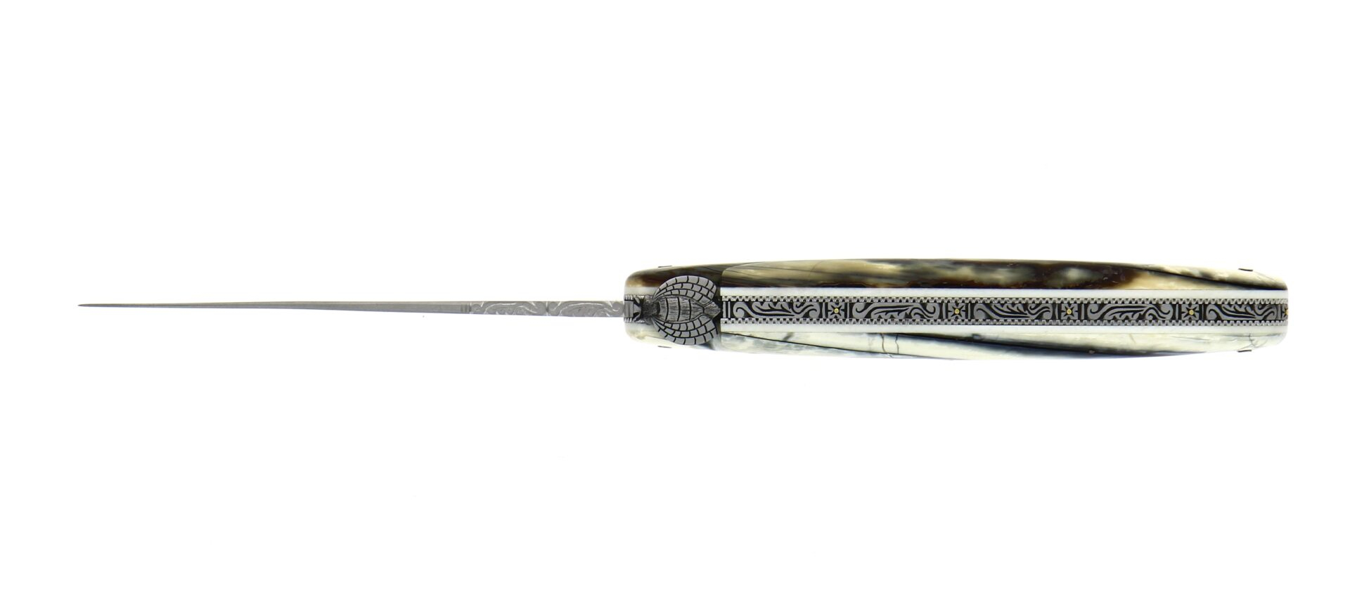 Ce couteau d'exception est un modèle 1 pièce, avec un manche en pulpe de mammouth et un placage en os. Une belle abeille et son ressort travaillés viennent sublimer ce couteau pliant.