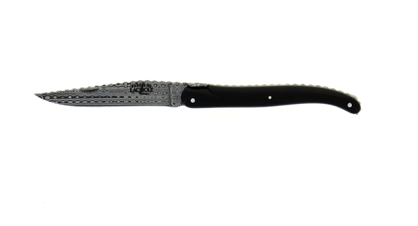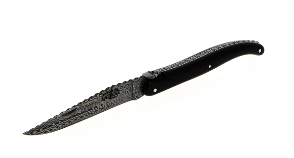 Ce couteau d'exception est un modèle 12 cm 1 pièce, plein manche en ébène, avec un ressort ciselé façon "ossature". Ce couteau a un motif "tête de mort" guilloché à la main à la place de la traditionnelle abeille. Une lame damas Munin et une finition satinée viennent sublimer ce couteau pliant.