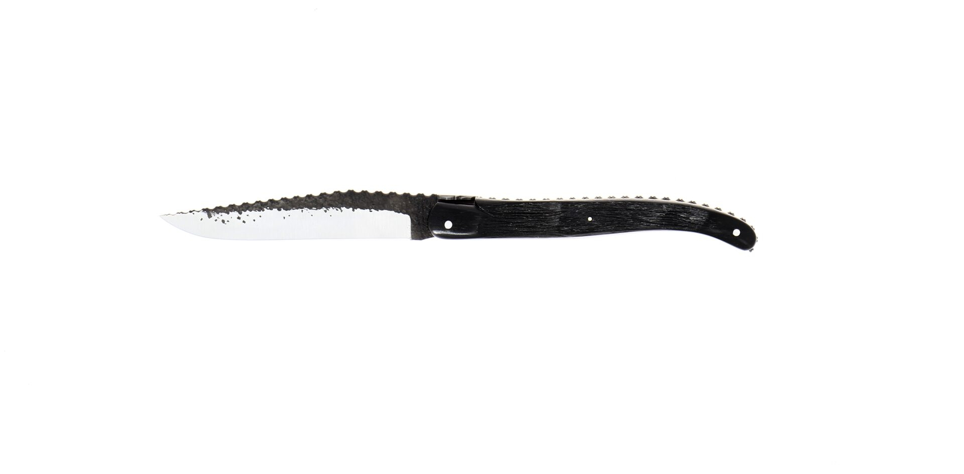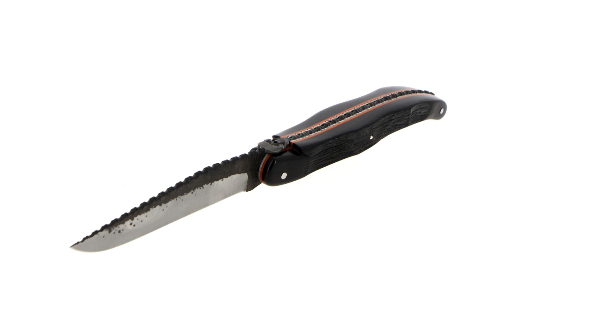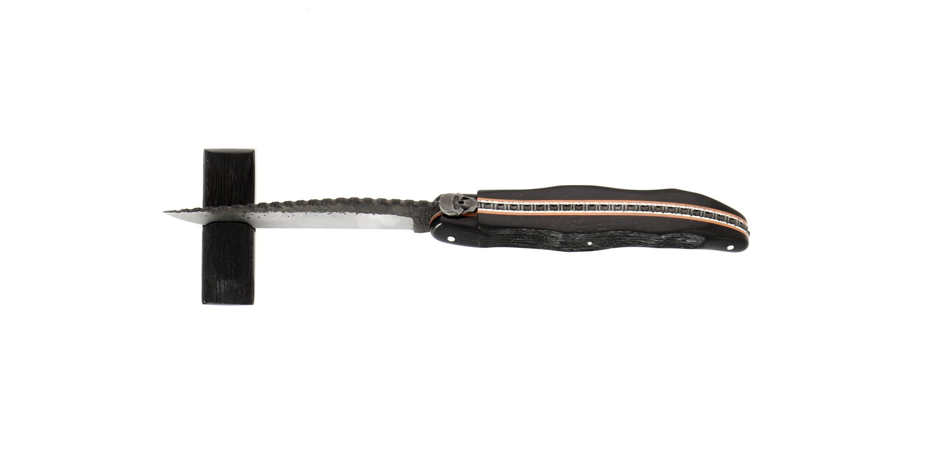 Ce couteau d'exception, modèle de 12 cm à une pièce, incarne l'élégance et l'originalité. Son plein manche en ébène, un bois noble et raffiné, est complété par un ressort ciselé façon "vertèbres", témoignage du savoir-faire artisanal. Le détail unique de ce couteau est son motif "tête de mort" guilloché à la main, remplaçant l'emblématique abeille Laguiole, pour une touche audacieuse et contemporaine.