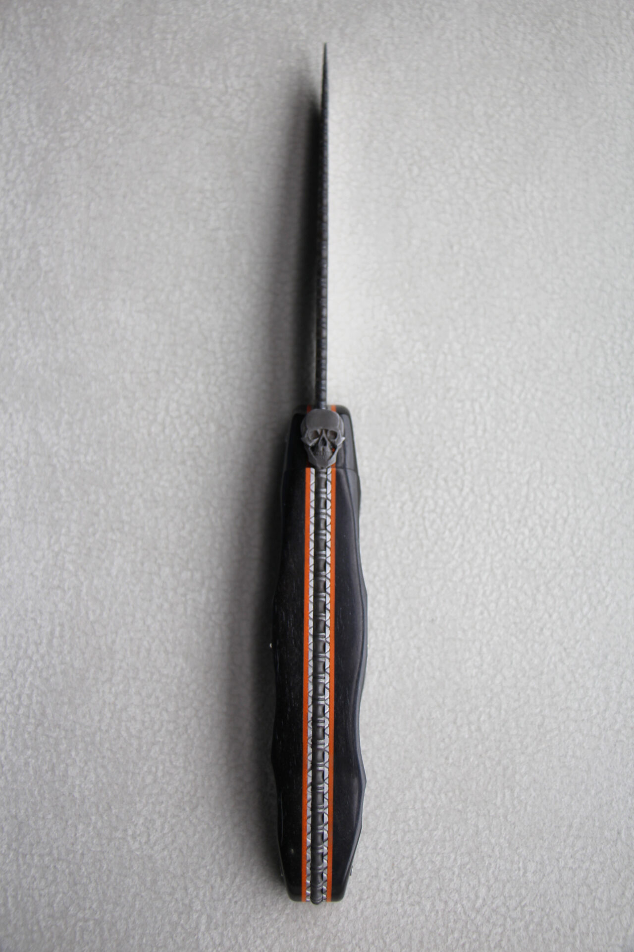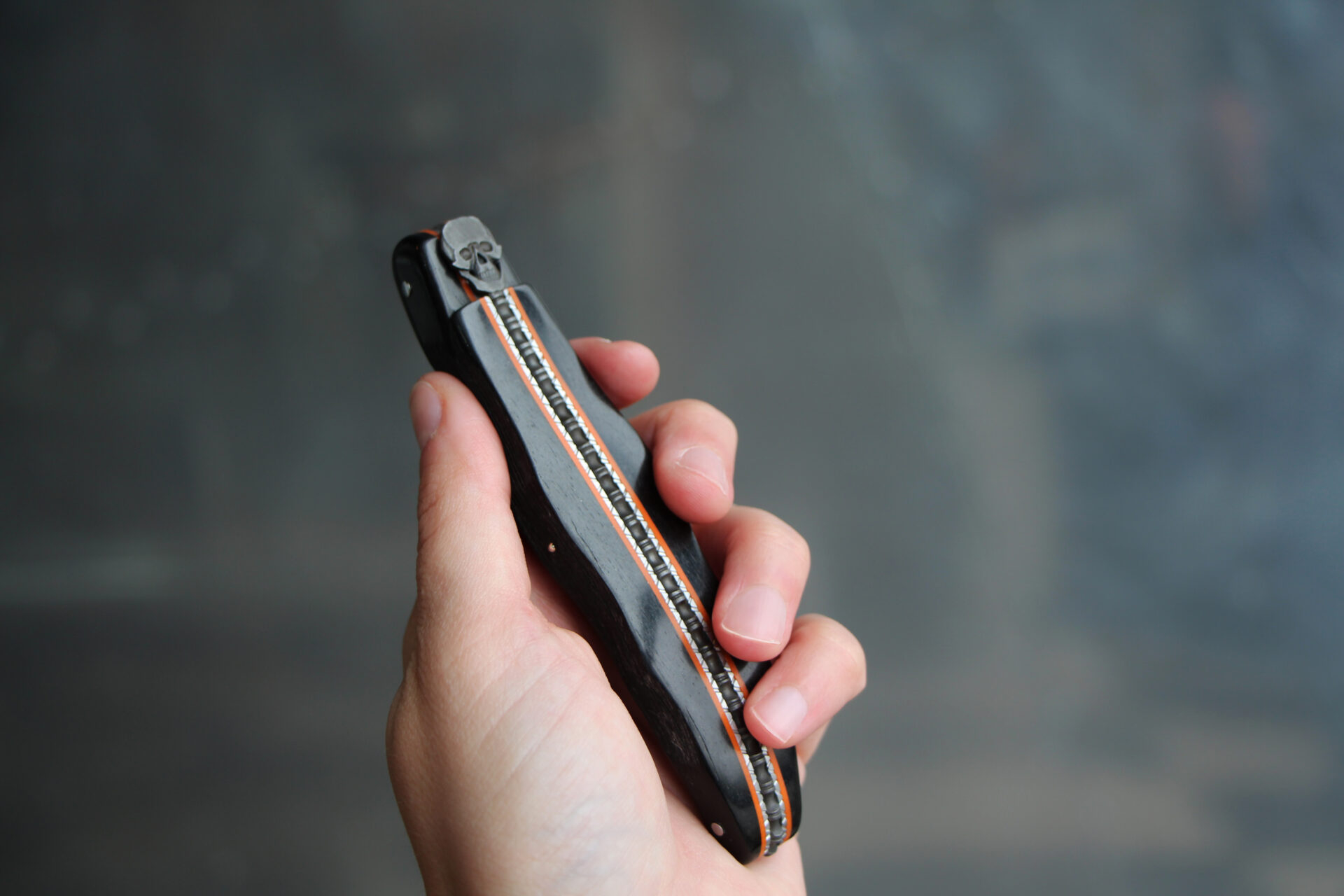 Sa lame brute de forge associée à une finition satinée souligne le caractère authentique de ce couteau pliant. Enfin, l'intercalaire orange ajoute une note lumineuse, créant un contraste subtil et élégant.