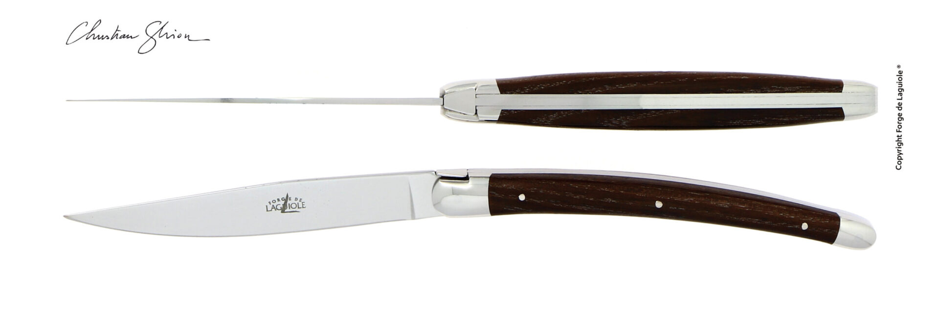 Ce couteau de table Forge de Laguiole ® dessiné par le designer Christian Ghion, est composé d'un manche en frêne densifié et d'une finition brillante. Ce couteau design à l'allure fine et courbe sera votre allié pour déguster un bon repas autour d'une belle table.