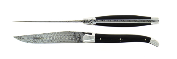 La gamme de couteau de table Collection Forge de Laguiole, manche en corne foncée et finition brillante avec l'abeille et le ressort ciselé main et une lame damas inox Munin.