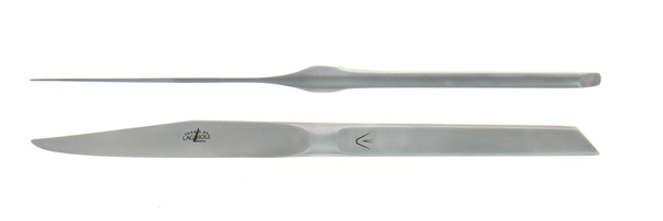 Ce couteau de table Signature Forge de Laguiole «Dayat» est un monobloc inox, avec un manche fin et en biseau qui vous promet finesse et stabilité sur votre table comme dans votre main. Il se place sur le côté de manière stable sans que la lame ne touche la table. C’est de manière fine et subtile que le Dayat laisse apparaitre son abeille stylisée, gravée sur son flanc.