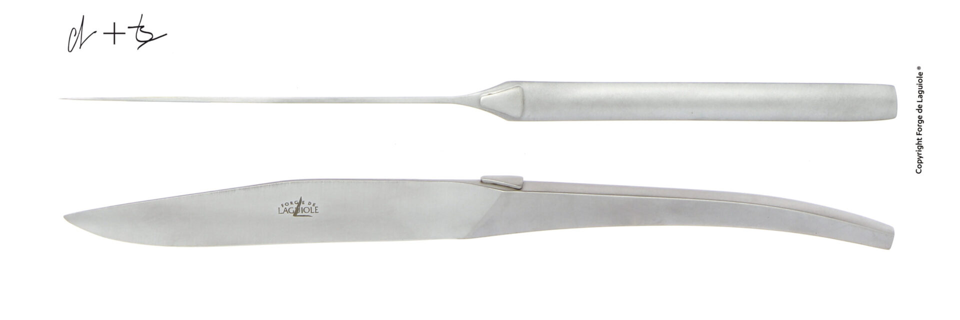 Ce couteau de table Forge de Laguiole ® dessiné par Catherine et Bruno Lefebvre n'est pas un Laguiole comme les autres. Il se présente comme un monobloc avec une finition brillante ou satinée. A l'allure singulière, ce couteau sera l'élément insolite de votre table.
