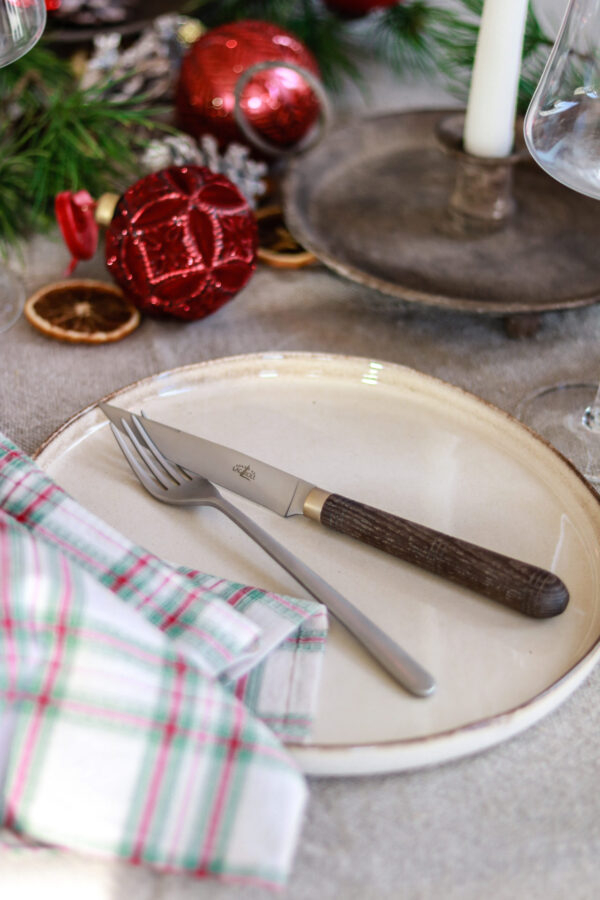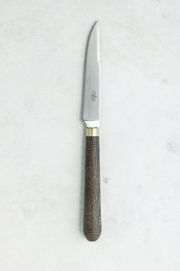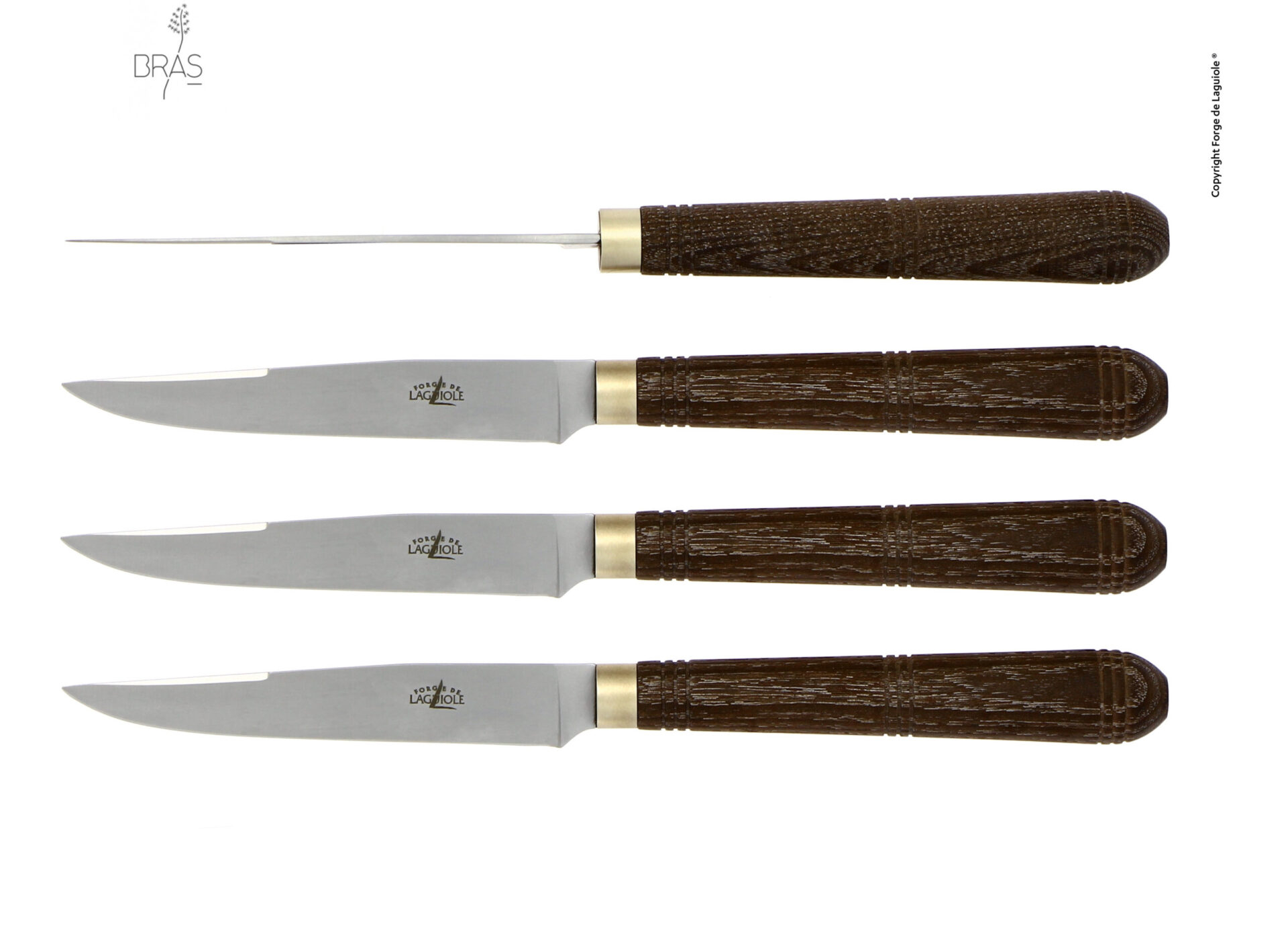Ce couteau original Forge de Laguiole ® dessiné par André et Michel BRAS, s'inspire de la forme d'origine du premier couteau apparu dans la région de l'Aubrac. Il était donc tout naturel que cette version revisitée soit fabriquée par notre coutellerie française emblématique. Son manche en frêne densifié et sa bague en laiton apportent authenticité et originalité à votre table.