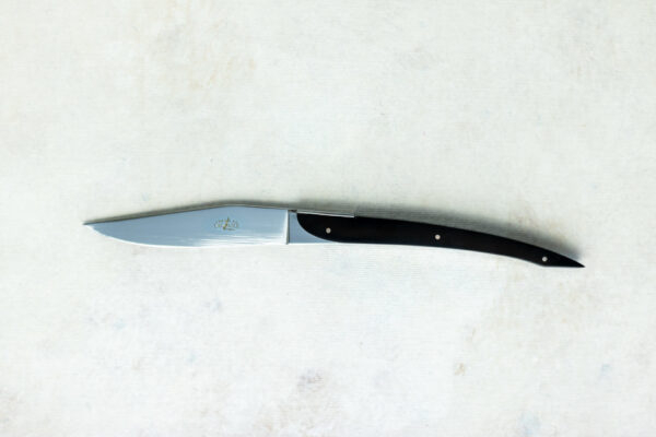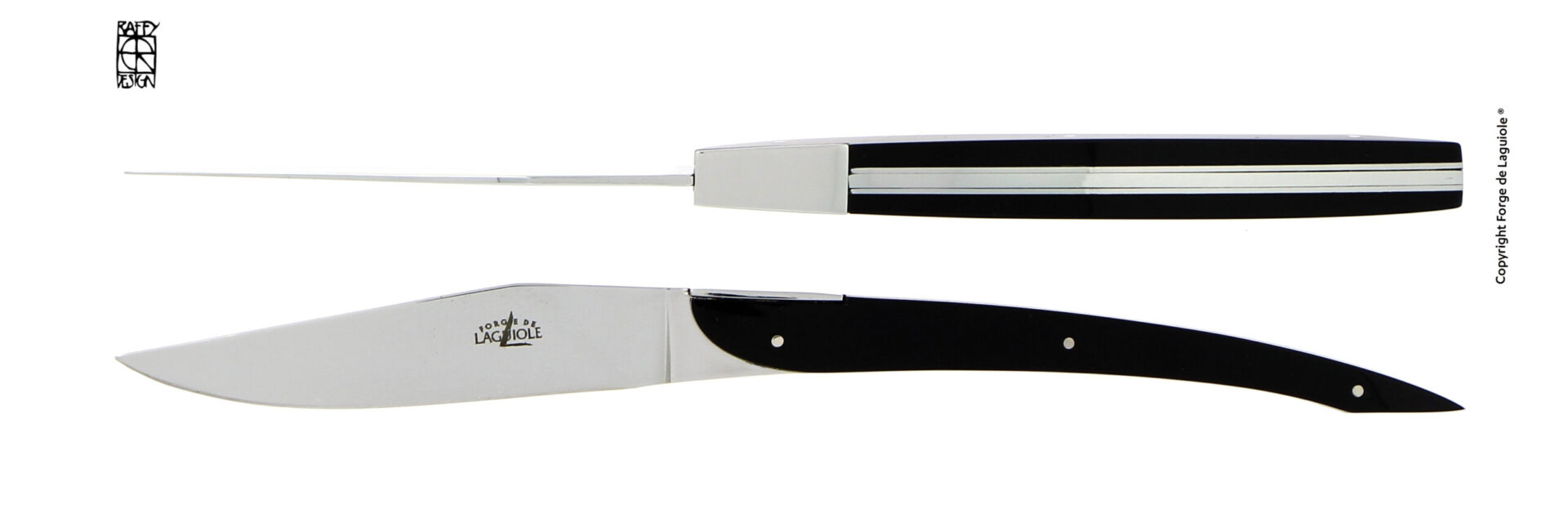 Ce couteau de table Forge de Laguiole® est signé par le designer Eric Raffy. Ce laguiole de table Signature est composé d'un manche en Acrylique noir et d'une finition brillante qui apportera élégance à votre table. Moderne et épuré, ce couteau qui vient rehausser l'art de votre table s'adaptera parfaitement à votre décoration et vos recettes.