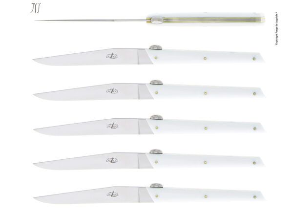 Couteaux de table Laguiole de la gamme Signature dessinés par Olivier Gagnère pour le restaurant JY'S doublement étoilé au guide Michelin et son chef Jean-Yves Schillinger . Ce modèle est dôté d'un manche en acrylique blanc, et de deux platines en laiton.