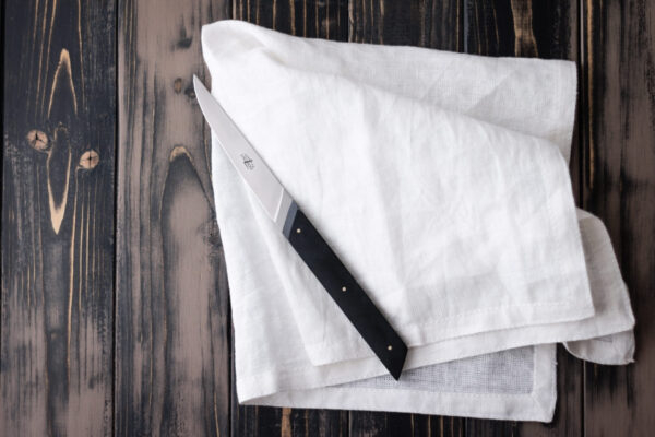 Ce couteau de table Forge de Laguiole® dessiné par le designer Santos Bregaña, est composé d'un manche en tissu compressé noir et d'une finition satinée.