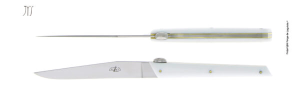 Couteaux de table de la gamme Signature dessinés par Olivier Gagnère pour le restaurant JY'S doublement étoilé au guide Michelin et son chef Jean-Yves Schillinger . Ce modèle est dôté d'un manche en acrylique blanc, et de deux platines en laiton.