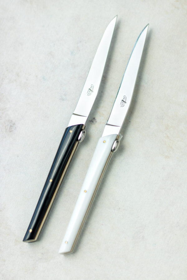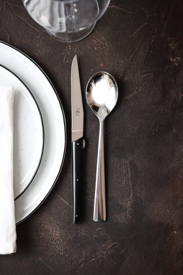 Couteaux de table de la gamme Signature dessinés par Olivier Gagnère pour le restaurant JY'S doublement étoilé au guide Michelin et son chef Jean-Yves Schillinger . Ce modèle est dôté d'un manche en acrylique noir, et de deux platines en laiton.