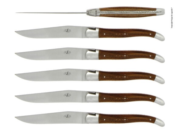 Ce coffret se compose de 6 couteaux de table haut de gamme avec le manche en bois, noyer, finition satinée.