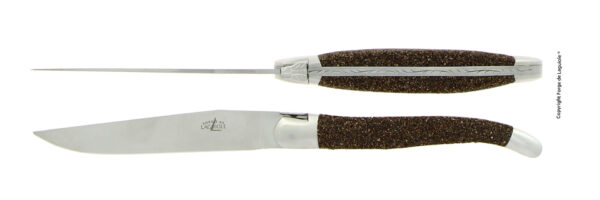 Le manche de ce couteau est constitué de sable extrait de la rivière de La Selves (coulant dans Laguiole) et aggloméré avec une résine naturelle. Représentation de la tradition et de l'innovation, ce procédé unique breveté représente une véritable Première dans l’histoire de la coutellerie internationale. Enfin ce sable est prélevé en quantité infime dans le cadre d’une autorisation préfectorale, dans des zones fortement ensablées et donc sans aucun impact sur l’environnement. Les photos présentes sur ce site sont non contractuelles.
