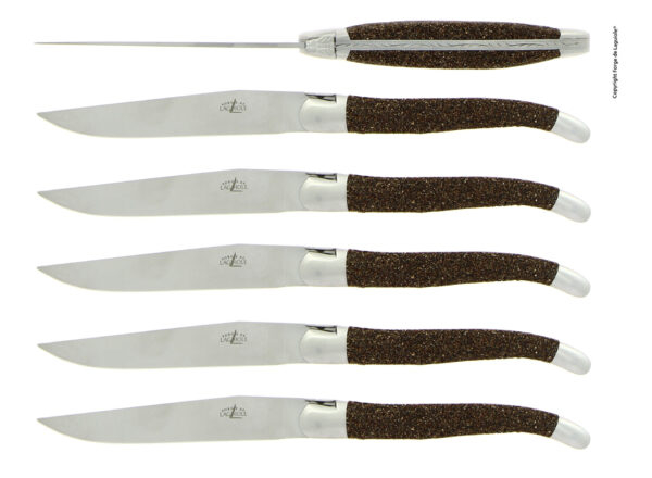 Le manche de ce couteau est constitué de sable extrait de la rivière de La Selves (coulant dans Laguiole) et aggloméré avec une résine naturelle. Représentation de la tradition et de l'innovation, ce procédé unique breveté représente une véritable Première dans l’histoire de la coutellerie internationale. Enfin ce sable est prélevé en quantité infime dans le cadre d’une autorisation préfectorale, dans des zones fortement ensablées et donc sans aucun impact sur l’environnement. Les photos présentes sur ce site sont non contractuelles.