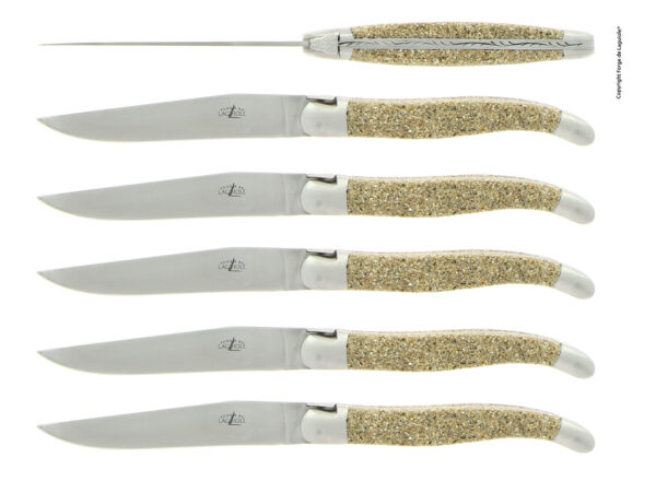 Le manche de ce couteau est constitué de sable extrait de la baie du Mont St Michel et aggloméré avec une résine naturelle. Représentation de la tradition et de l'innovation, ce procédé unique breveté représente une véritable Première dans l’histoire de la coutellerie internationale. Enfin ce sable est prélevé en quantité infime dans le cadre d’une autorisation préfectorale, dans des zones fortement ensablées et donc sans aucun impact sur l’environnement. Les photos présentes sur ce site sont non contractuelles.