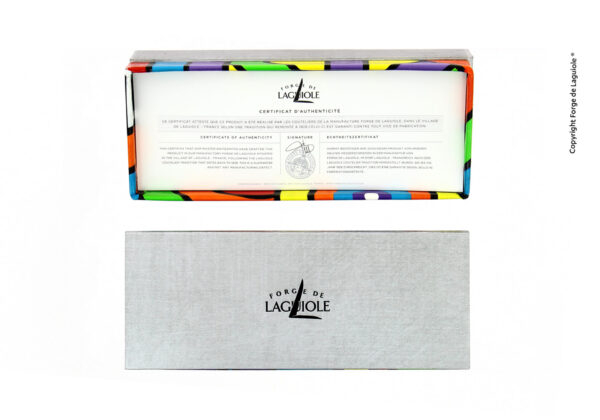 Cette édition limitée est disponible en 16 exemplaires numérotés. Pour cette gamme, un coffret unique accompagne le couteau, il est réalisé à partir d’une véritable toile de l’artiste Happywallmaker - Seize. Chacun de ces 16 couteaux dispose d’un certificat d’authenticité signé par l’artiste.