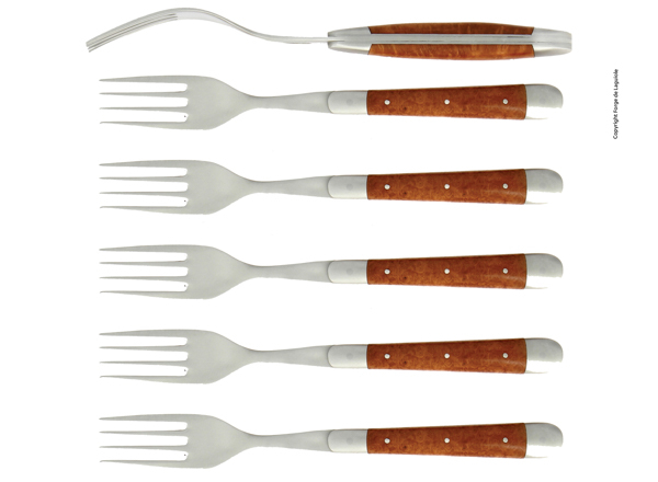 Ce coffret se compose de 6 fourchettes Laguiole avec le manche en bois, bruyère, finition satinée.