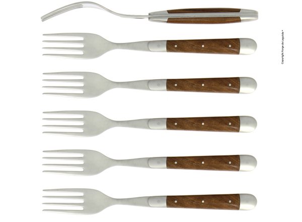 Ce coffret se compose de 6 fourchettes Laguiole avec le manche en bois, noyer, finition satinée.